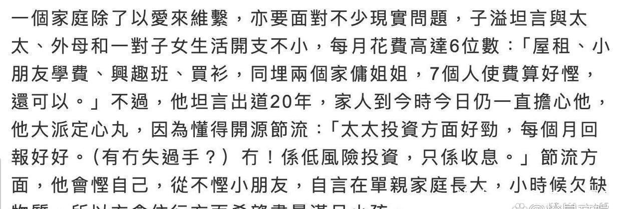 每个月的家庭开销高达六位数,罗子溢毫不讳言。一家七口——自己、杨怡、两个孩子、岳母以及两个家佣——每月的支出都要考虑周全。房租占了大头,每月6万港币就这样花掉了,另外孩子的学费、兴趣班、衣食花销,也都是不小的数字。而夫妻二人的开销,反而最少,几乎把最好的都留给了孩子。