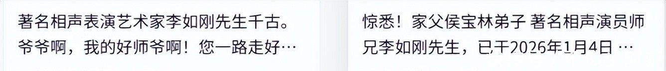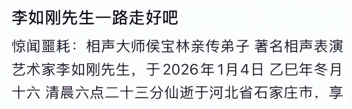著名相声表演艺术家、侯宝林先生弟子李如刚,于 2026 年 1 月 4 日清晨 6 点 23 分在河北省石家庄市河北省中医院因病医治无效仙逝,享年 89 岁。